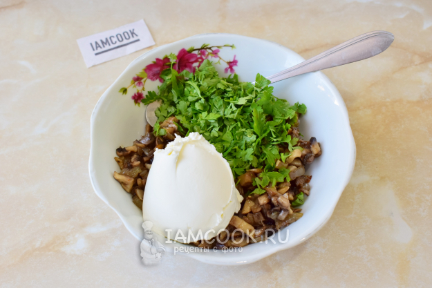 Остывшие грибы смешайте с творожным сыром и измельченной зеленью.