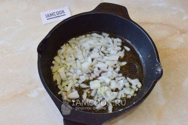 Лук очистите от шелухи и ополосните в холодной воде. Затем мелко нарежьте. На горячую сковороду налейте немного растительного масла и обжарьте лук 1-2 минуты. Он станет прозрачнее.