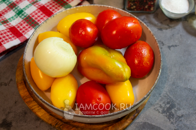 Помидоры выберите плотные, без повреждений. Помойте овощи, лук, чеснок и перец очистите.