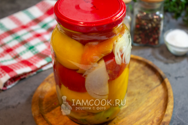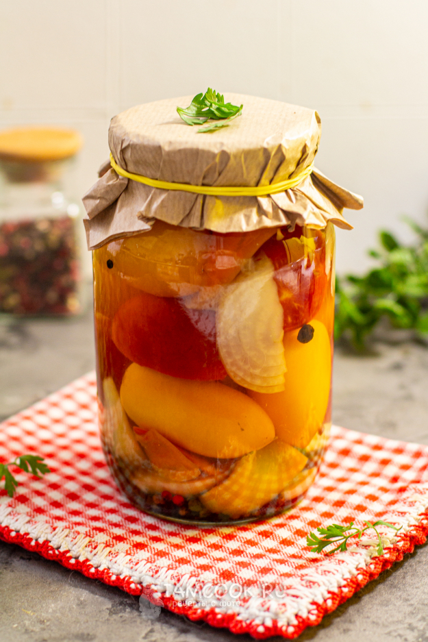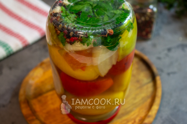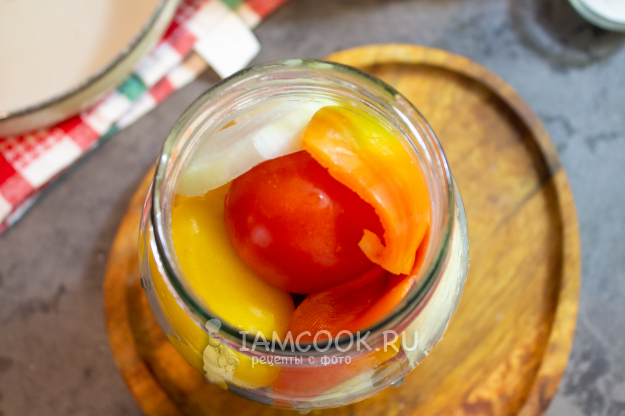 Затем уложите помидоры, чередуя с луком и перцем. Таким образом наполните банку.