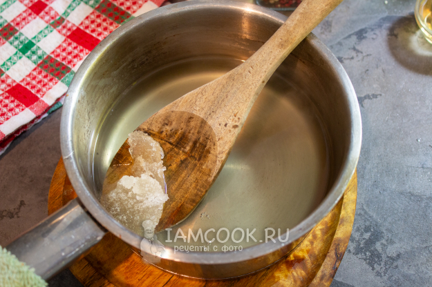 По истечению времени слейте жидкость из банки в ковш, добавьте соль и сахар. Доведите до кипения и тщательно перемешайте, чтобы растворились соль и сахар. Снимите посуду с плиты и добавьте набухший желатин, перемешайте и влейте уксус.
