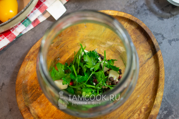 В чистую банку, предварительно помытую содой и простерилизованную удобным способом, уложите на дно свежую помытую зелень, чеснок и перец горошком.