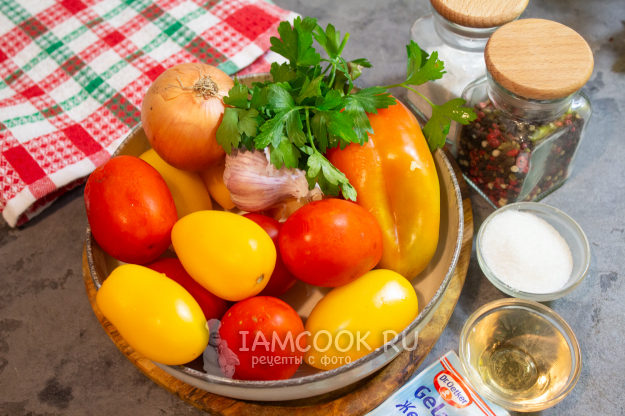 Соберите необходимые продукты для заготовки помидоров в желе на зиму без стерилизации. Я использую два вида помидоров: красные и желтые, сорта сливка. Также добавлю немного свежей петрушки, которую можете заменить на ту зелень, которая вам больше нравится.