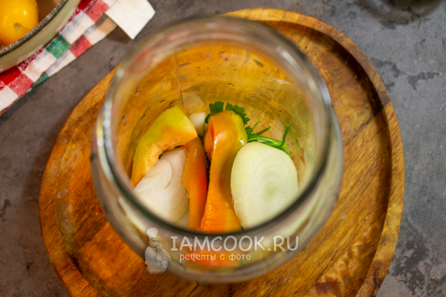 Лук нарежьте кружочками, а перец - полосками. Уложите в банку пару кружочков лука и несколько полосок перца.