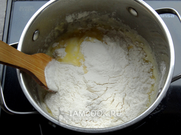 И сразу тщательно перемешать массу, чтобы не было комочков и сухой муки.