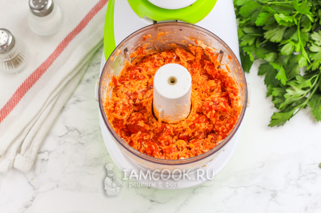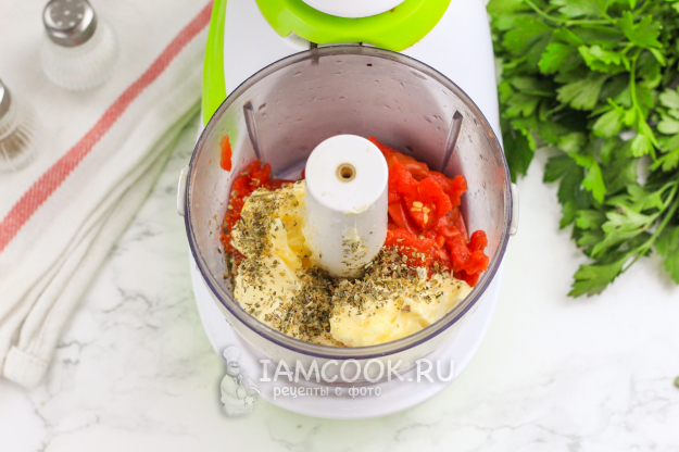 Выложите томатную мякоть в чашу измельчителя или блендера. Добавьте туда же сливочное масло, соль и приправы, специи.