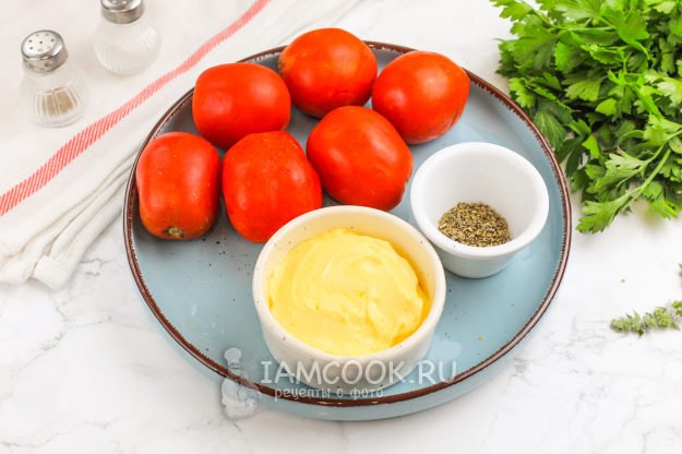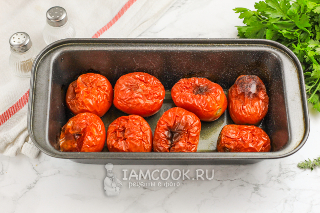Помидоры промойте в воде, обсушите бумажными салфетками и запеките примерно 20 минут при 180 градусах в духовке.