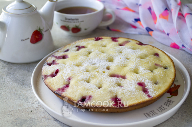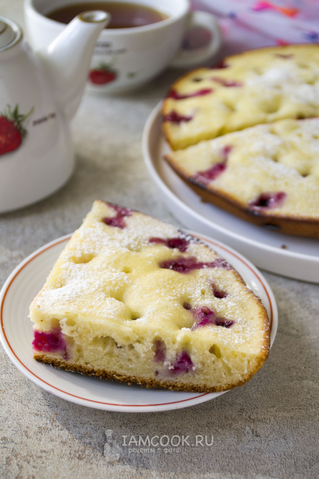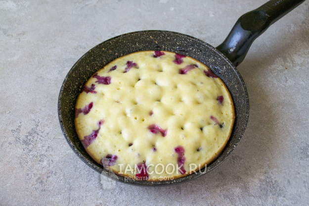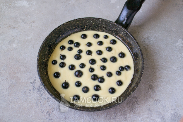 Закройте сковороду крышкой и поставьте на самый минимальный огонь. Готовьте пирог с черной смородиной на сковороде примерно 30-40 минут, в зависимости от высоты теста. У готового пирога края отходят от сковороды, поверхность матовая, не жидкая, а деревянная шпажка выходит сухой из центра.