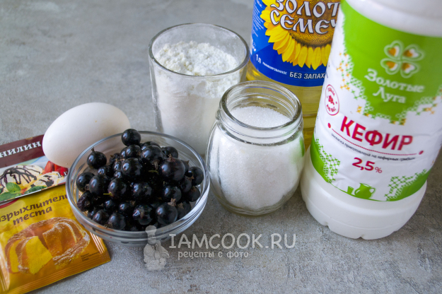 Соберите продукты для приготовления пирога с черной смородиной на сковороде. Ягоды вымойте и обсушите.