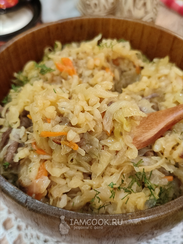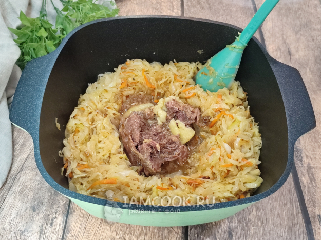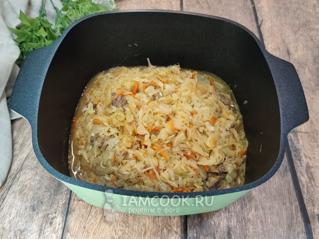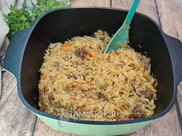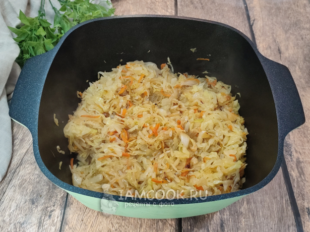 Закладываем капусту, обжариваем, периодически помешивая, до мягкости и готовности всех овощей. Время приготовления будет зависеть от жесткости капусты.
