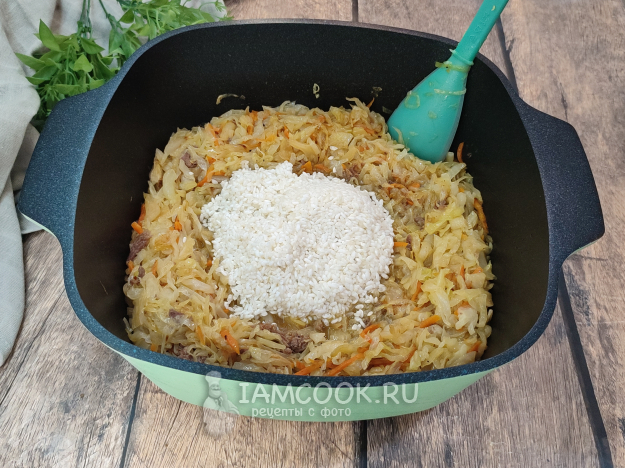 Накройте рис капустой, как бы закопайте)). Капуста дала сок во время приготовления, и я вижу, что его будет достаточно для того, чтобы рис приготовился. Если ваша капуста оказалась "сухой" и влаги в казане нет, добавьте обычной воды, примерно 1 стакан. Накройте крышкой, готовьте на среднем огне 12-15 минут.