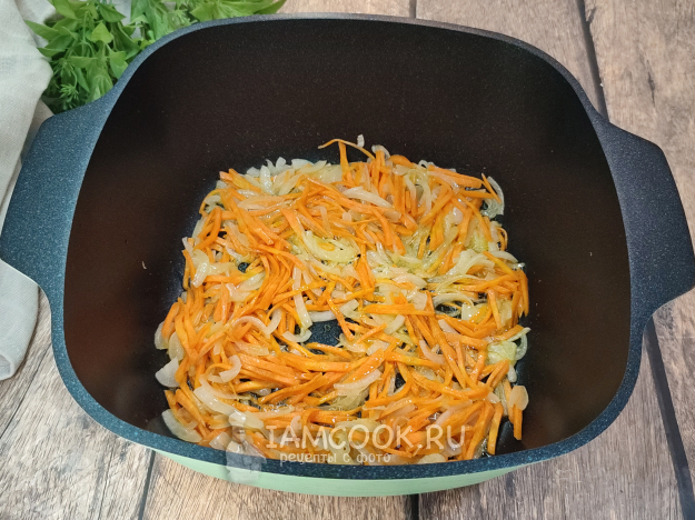 Добавьте морковь, обжарьте пару минут, помешивая.