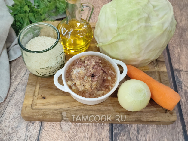 Соберите ингредиенты для приготовления капусты с тушенкой и рисом. Капусты поначалу кажется слишком много, но она сильно уменьшится в объёме)).