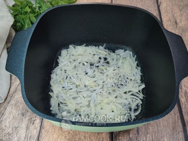 В сковороде или казане разогрейте масло, выложите лук, обжарьте до прозрачности.
