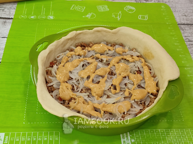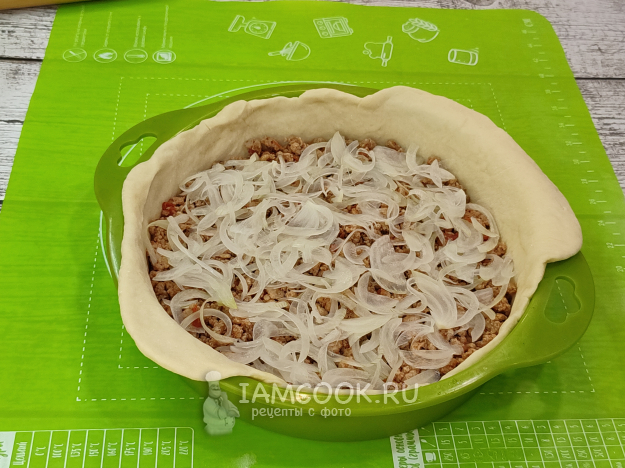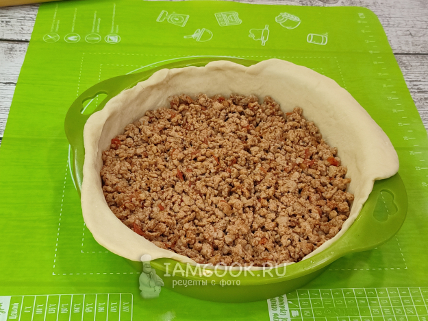 Укладываем начинку. Сначала остывший фарш с томатом.