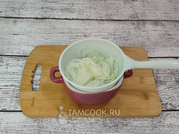 Затем откиньте лук на сито, пусть жидкость стечет. Благодаря этому лук в готовом пироге будет не злым, не резким, но при этом останется хрустящим.