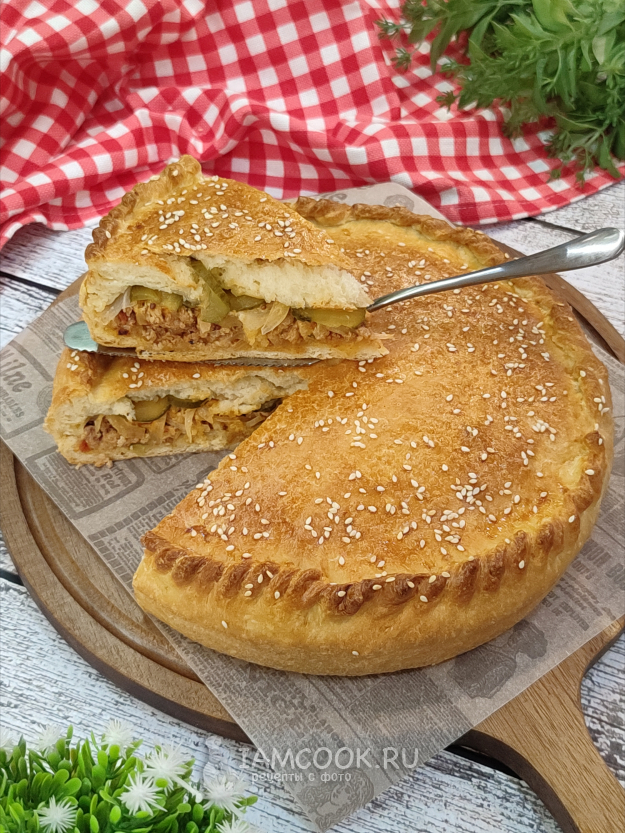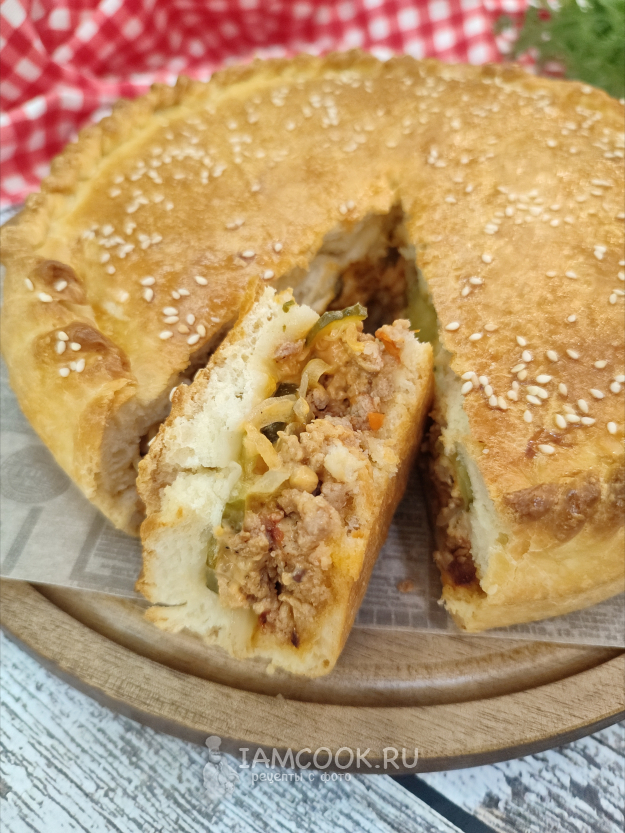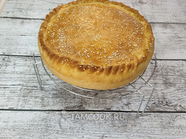 Дайте пирогу расстояться минут 20-25, прикрыв пленкой. Затем яйцо взболтайте с 1 ст. л. воды, смажьте верх пирога (или можно смазать просто молоком). По желанию присыпьте кунжутом.