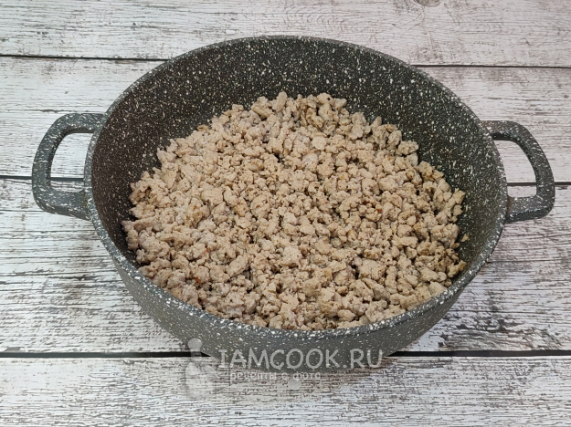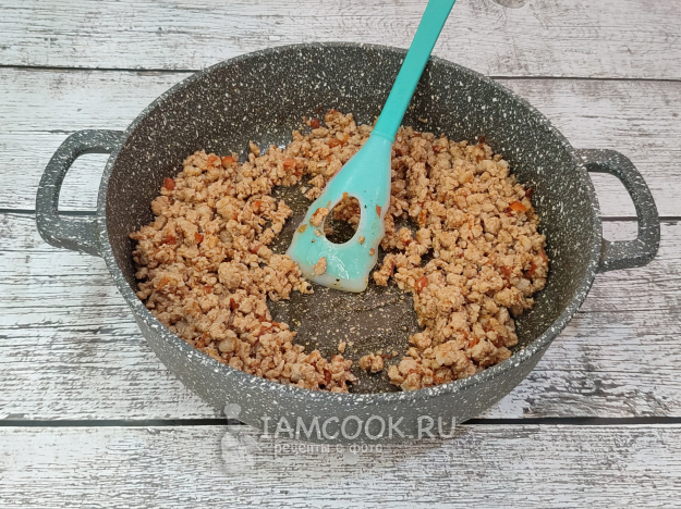 В сковороде разогрейте масло, обжарьте фарш. Добавьте по вкусу соль и любимые специи. Я добавила соль, перец, готовую смесь для мяса и 1 ч. л. вустерского соуса.
