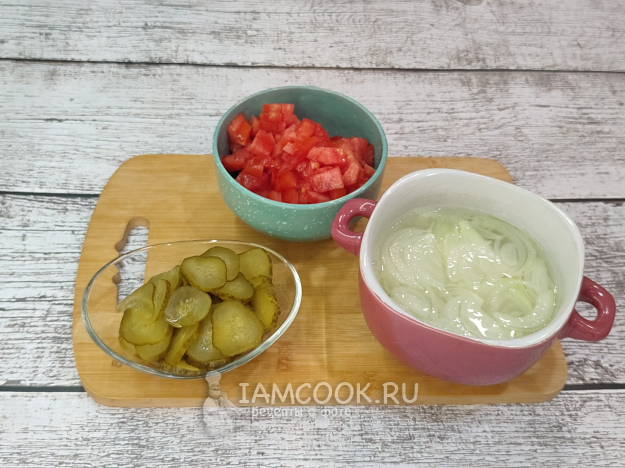 Пока займемся начинкой. Огурцы нарежьте тонкими кружочками, помидоры - кубиками, лук - тонкой соломкой. Лук залейте кипятком на пару минут.