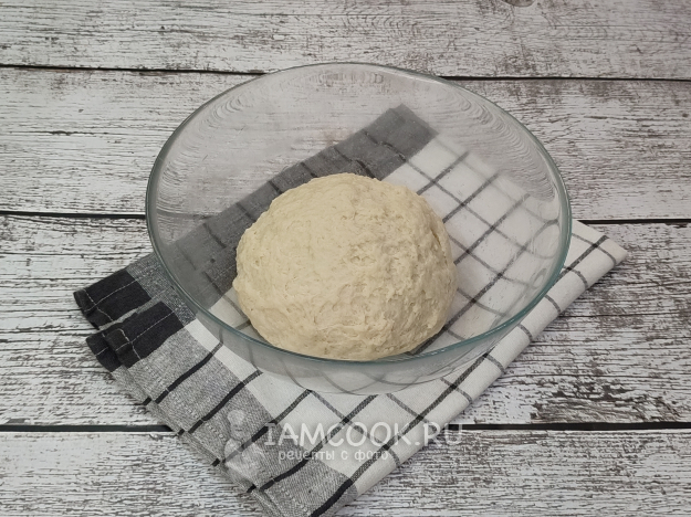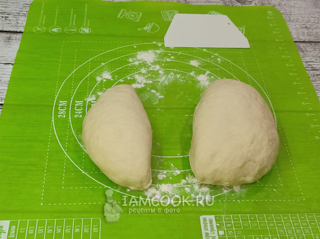 Отдохнувшее тесто один раз обминаем, даем снова подняться. Затем делим на две части - 1/3 и 2/3.