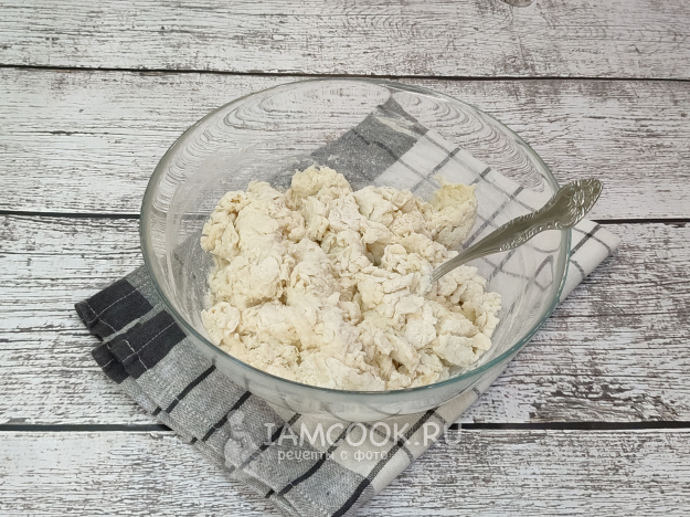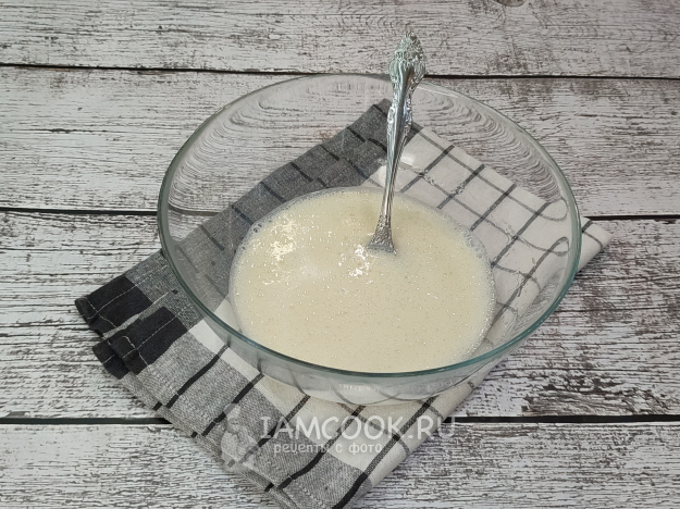 Всыпьте большую часть муки, примерно граммов 400, дрожжи, перемешайте ложкой.