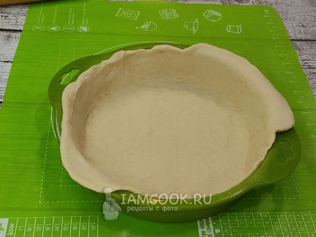 Большую часть раскатываем в не очень тонкий пласт диаметром несколько больше вашей формы для выпечки. Выкладываем в форму. Не забудьте смазать форму маслом или застелить пергаментом.