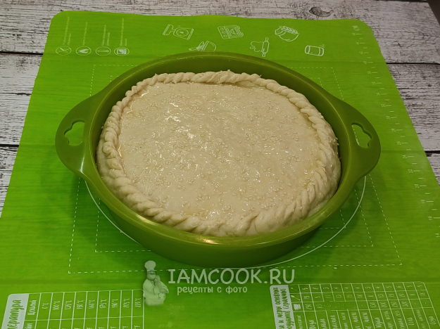 Обрежьте лишнее тесто, смешайте со второй частью теста, раскатайте круг, но уже небольшой, примерно диаметром как ваша форма. Перенесите ее на верх пирога, соедините края. Сначала просто залепите.