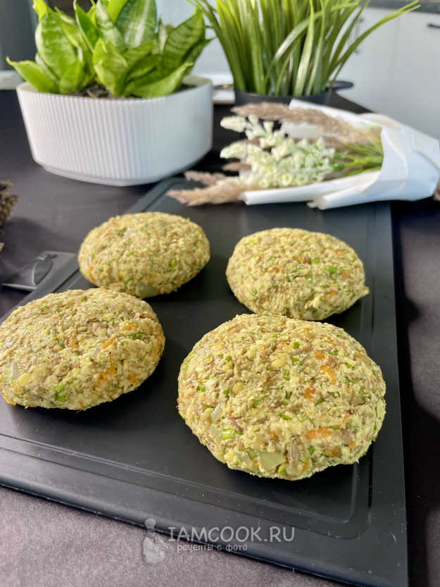 С заранее замоченной на ночь чечевицы сливаем воду и измельчаем чечевицу в блендере. В чашку перекладываем измельченную чечевицу, добавляем к ней соль, обжаренные морковь и лук, смесь перцев, хмели-сунели, мелко нарезанный укроп, петрушку и выдавливаем чеснок. Перемешиваем и руками формируем котлеты.