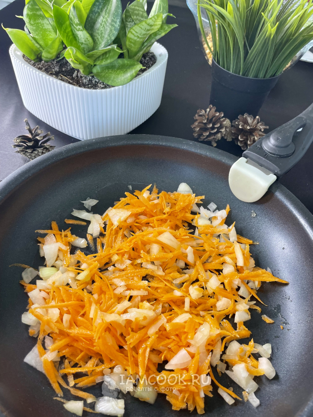 Для начала приготовим котлеты. Морковь натираем на крупной терке. Лук нарезаем кубиками и обжариваем на сковороде.