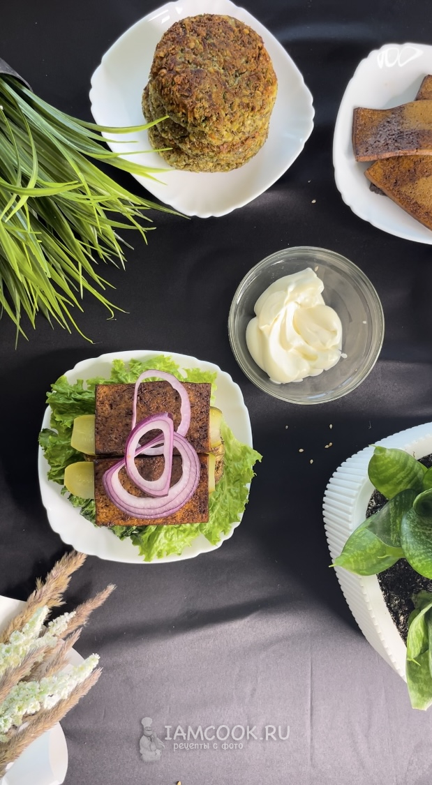 Мы всё подготовили. Теперь можно собирать бургер. Разрезаем булочку и мажем на одну половинку постный майонез. Кладем листья салата, помидор, чечевичную котлету, огурец, тофу, красный лук. На вторую половинку булочки мажем горчицу по вкусу и накрываем бургер.