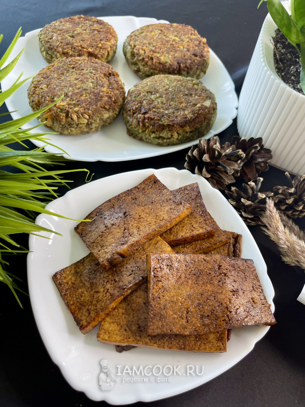 Обжариваем котлеты на среднем огне, переворачиваем, затем закрываем крышкой и готовим еще 1 минуту. Нарезаем тофу и смачиваем с двух сторон в соевом соусе. Обжариваем с двух сторон на растительном масле по 1 минуте.