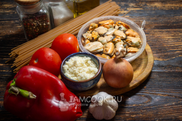 Соберите необходимые продукты для приготовления гречневой лапши с мидиями.