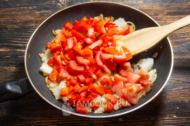 Помидоры нарежьте небольшим кубиком и отправьте в сковороду к овощам.