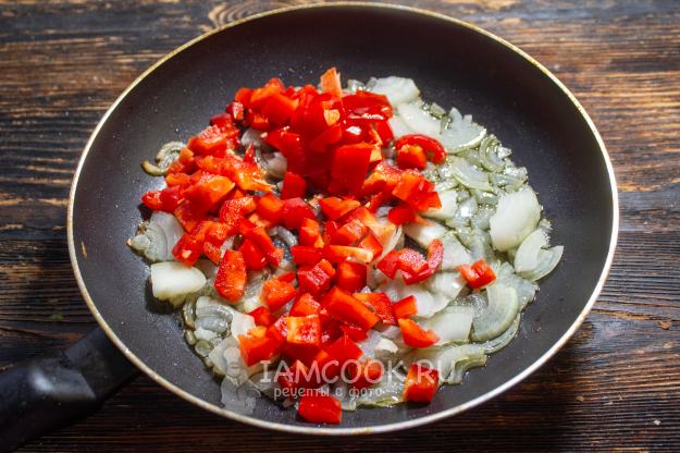 Добавьте нарезанный на небольшой кубик сладкий перец, готовьте несколько минут.