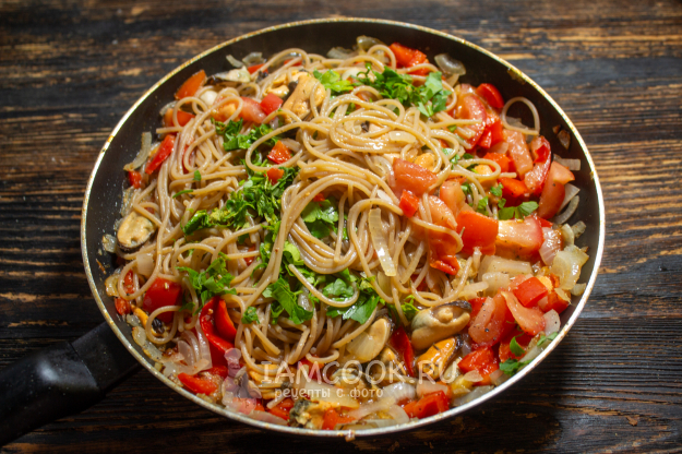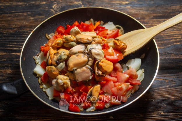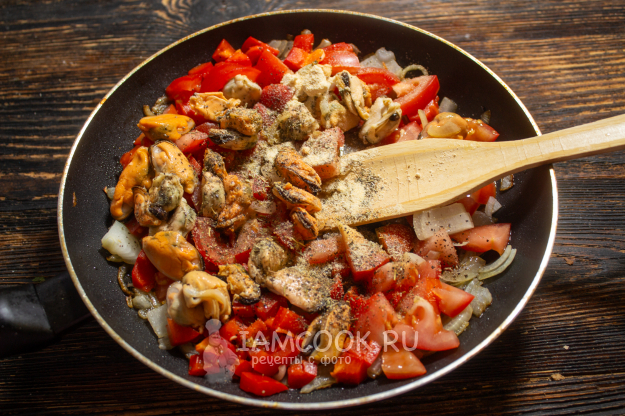 Добавьте в сковороду специи на ваш вкус, перемешайте и тушите овощи с мидиями минут 5-7.