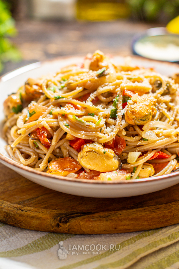 Гречневую лапшу с мидиями подавайте немедленно! Присыпав небольшим количеством тертого пармезана.