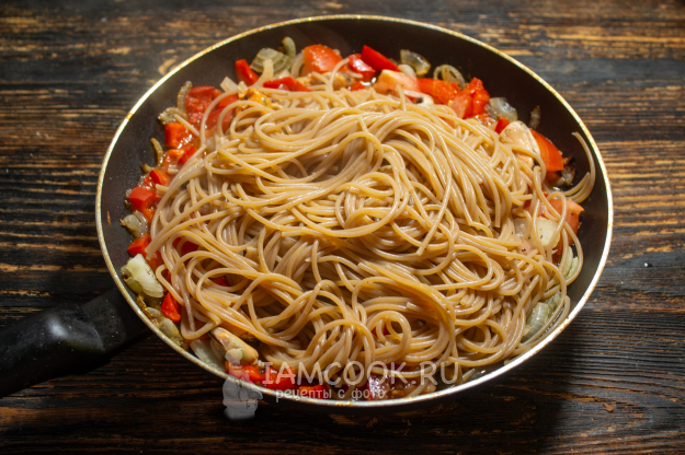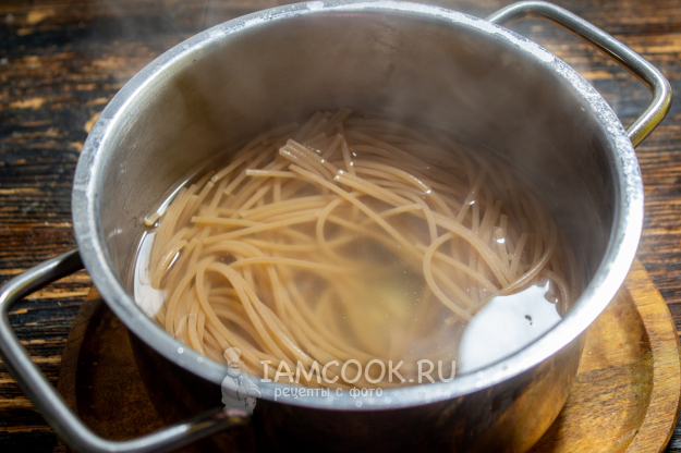 Первым делом поставьте на плиту кастрюлю с водой, доведите до кипения и подсолите. Опустите гречневую лапшу и готовьте ее согласно инструкции.