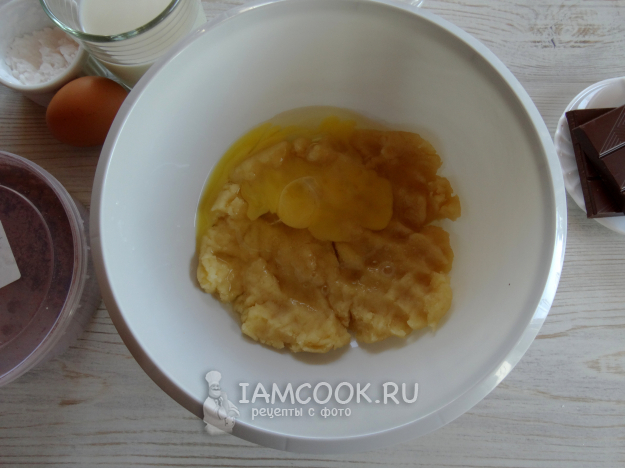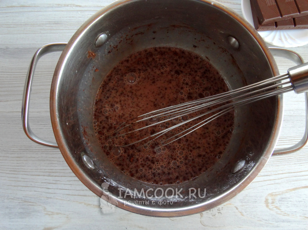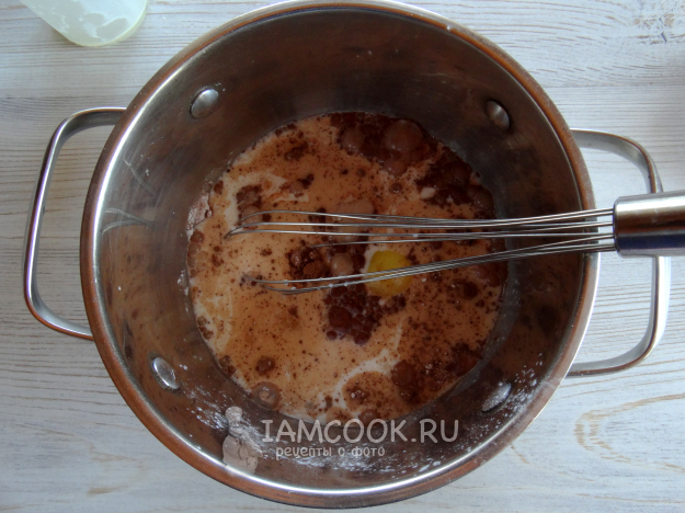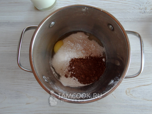 В кастрюле соединить яйцо, сахар, какао и крахмал.