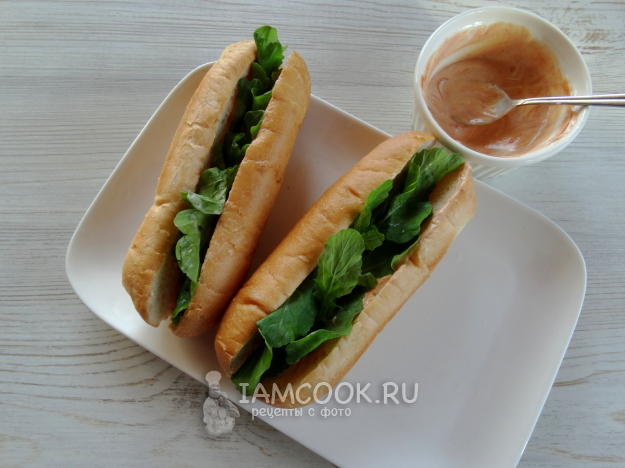 Горчицу, кетчуп и майонез перемешать. Промазать соусом внутри булочки.