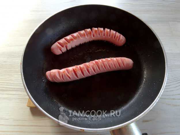На сосисках сделать разрезы (для красоты). Обжарить до румяного состояния на масле.