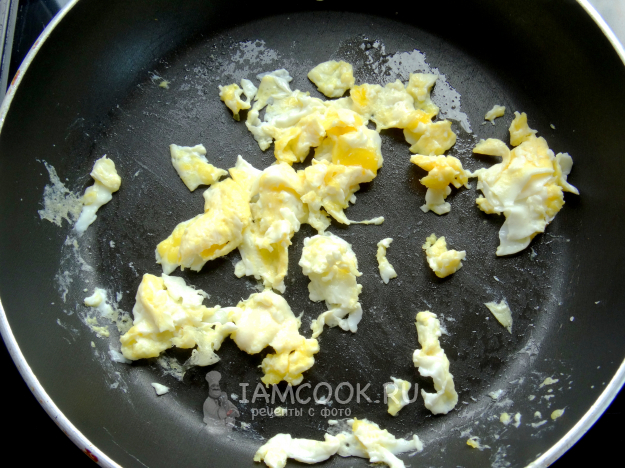 На этой же сковороде поджарить яйцо, а именно сделать скрэмбл, "разбив" яйцо лопаткой. Подсолить и поперчить по вкусу.