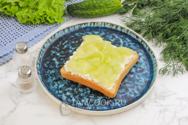 Добавьте сверху остатки огуречной нарезки. На второй ломтик хлеба выложите промытый лист салата, предварительно стряхнув с него всю лишнюю влагу.