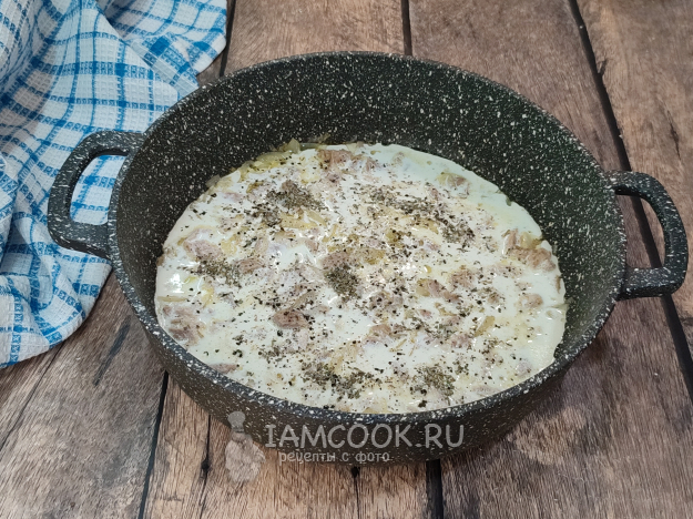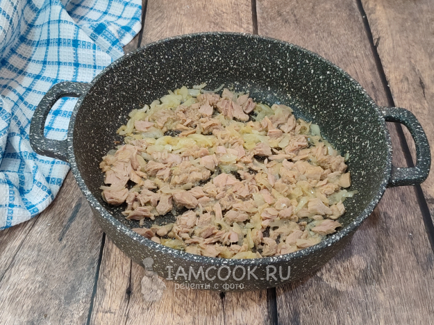 Выложите тунца, разломайте его лопаточкой, перемешайте.