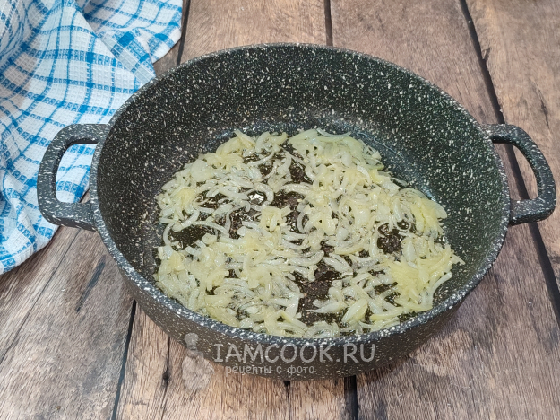 Готовится всё очень быстро, поэтому сначала поставьте воду для пасты на огонь, посолите. В сковороде разогрейте масло, обжарьте до прозрачности и мягкости нарезанный лук.