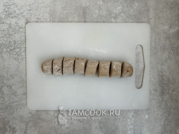 Из теста раскатайте колбаску, разделите ее на несколько частей.