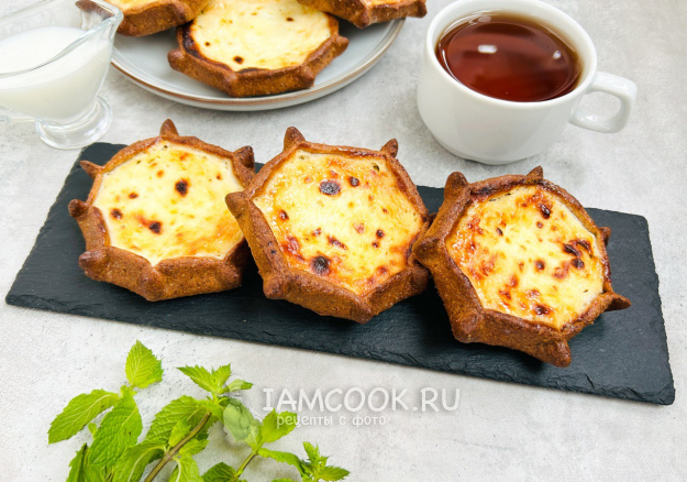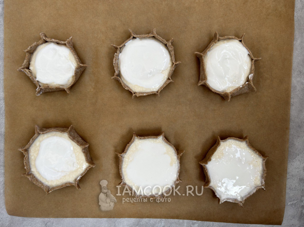 Разогрейте духовку до 200 градусов. Выложите калитки на пергамент. Сверху выложите по 1 ст. ложке сметаны. Выпекайте в течение 20-25 минут, до золотистой корочки.