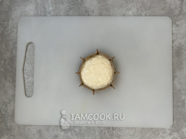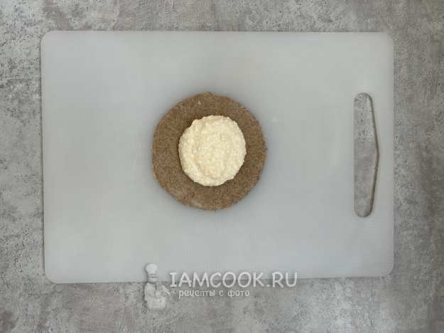 Раскатайте каждую в небольшую лепешку, толщиной около 3 мм. В центр каждой лепешки выложите начинку, оставив края свободными.