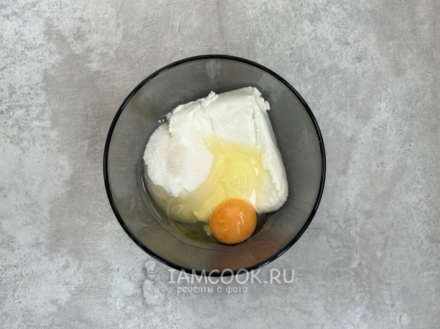 Подготовьте начинку. Возьмите творог. Если у вас он слишком крупный, протрите его через сито, чтобы он стал однородным. Добавьте куриное яйцо и сахар. Всё хорошо перемешайте.