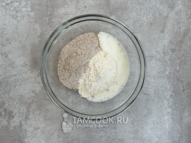 В глубокой посуде смешайте два вида муки, добавьте кефир комнатной температуры и щепотку соды.