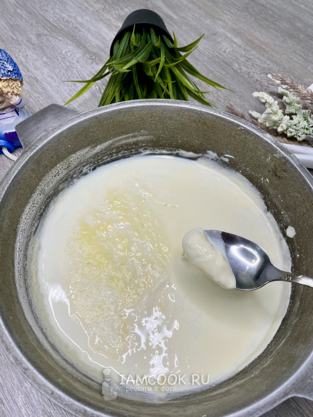 На поверхности молока образовался каймак. Аккуратно снимаем его ложкой и перекладываем в пиалу.